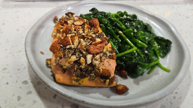 - Garlic sautéed spinach adds savory warmth and an earthy complement to the crisp salmon topping.