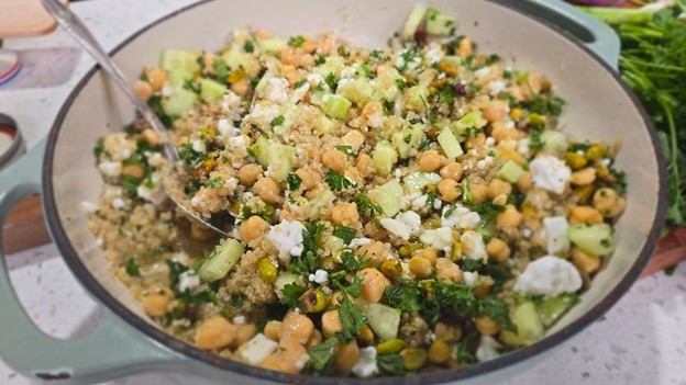 - Fiber: Quinoa, chickpeas, cucumbers, and onions are packed with fiber. Fiber keeps your blood sugar steady all day, so you won’t crash in the afternoon. It’s also vital for gut and heart health.